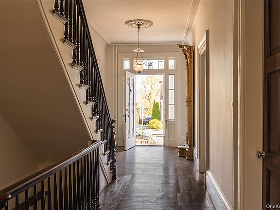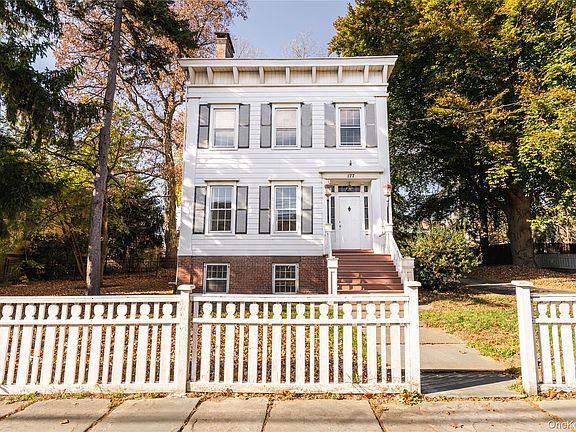 Step into the grandeur of this 1840s masterpiece, situated on an expansive half-acre lot. Boasting a magnificent 5 bedroom triplex on top of a charming 1 bedroom garden-level apartment, this multi-family home perfectly balances historic elegance and modern updates. Original details abound, including soaring ceilings, intricate plaster moldings, hardwood floors, pocket window shutters, and massive pocket doors that seamlessly connect the living spaces. With 5 fireplaces present, 4 are original marble. The home’s sunroom and covered back porch overlook the sprawling yard, offering a serene oasis rarely found in the city. Newly updated kitchens and bathrooms with brand-new appliances offer modern functionality. Located near the Hudson River waterfront, shops, and dining, this home is a rare opportunity to own a piece of Newburgh’s architectural history, and perfect for anyone looking to live in a beautiful historic home on the best block in the City of Newburgh.