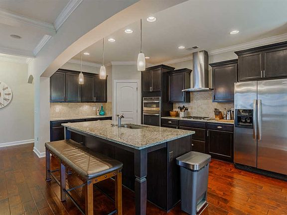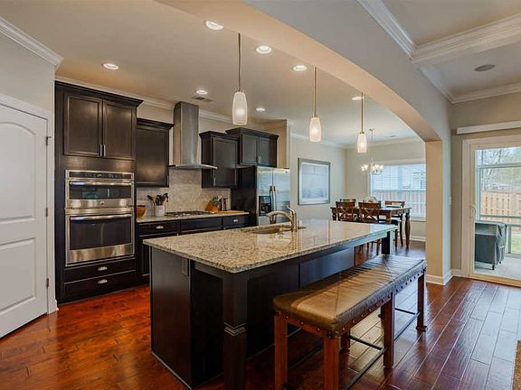 - RoomKitchenFeatures: Granite Counters, Kitchen Island, Pantry, Recessed Lighting, Eat-in Kitchen, Floors-Hardwood, Cabinets-Stained, Backsplash-Tiled
