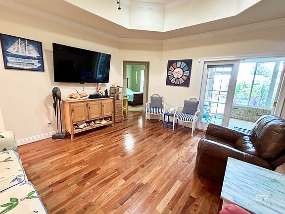 Charming 2BR Home with a wonderful SUNROOM located in Live Oak Village - Foley’s premier 55+ community! This home was originally built as a 3BR - and a wall was removed between BR #2 and BR #3 making it ONE LARGE BEDROOM! You'll love this spacious layout! Enjoy beautiful hardwood floors flowing through the main living area, crown molding, and elegant trey ceilings that add a touch of sophistication. The kitchen is a cook’s delight, featuring solid surface countertops, a tiled backsplash & a new dishwasher (2024) for easy cleanup. The HVAC system was replaced in 2023, providing peace of mind and energy efficiency for years to come. The LARGE PRIMARY BEDROOM offers a beautiful trey ceiling and French doors to the Sunroom. There's a spacious closet right off the Primary Bath that flows right into the laundry room. Relax and unwind in your HEATED/COOLED SUNROOM, perfect for enjoying morning coffee or peaceful evenings. The backyard offers PRIVACY, a wonderful Patio for grilling and is FULLY FENCED. The front yard has several fruit trees including lime, satsuma, lemon and orange trees. Live Oak Village offers MAINTENANCE-FREE LIVING, with yard maintenance included in the monthly fee. Enjoy an active lifestyle with daily activities at the clubhouse, along with access to both indoor and outdoor pools, tennis/pickleball courts, and a fully equipped fitness center. Located just minutes from South Baldwin Regional Medical Center, grocery stores, restaurants, and shopping – everything you need is within easy reach. Don’t miss this opportunity to live in one of Foley’s most sought-after communities! Small deep freezer in kitchen, refrigerator in garage & 2 wall mounted TVs can convey. Buyer to verify all information during due diligence.