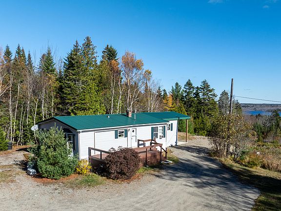 Expansive Hadley Lake Views from this privately set, metal-roofed home on 5.74 acres. These two combined lots are elevated above Hadley Lake and the landscape can be viewed for miles. Facing east the sun rises are spectacular. Both lots have trees lining the abutting line for privacy. The adjoining lot is recently cleared and ready for a future build. The year-round double wide has a large bedroom addition suite with bath that has double sink and shower and the bedroom is facing the lake with a separate covered entrance patio. Off the kitchen is a big south-facing deck with retractable awning is great for sunning, grilling, entertaining, and star-gazing. The level lawn has ample parking and comes with a large storage-shed and double oil tanks. The one-floor living layout is efficient: kitchen has easy access to the washer and dryer and is next to open dining room and living room with high ceilings and a propane fired stove. The guest bath has a shower/tub combo. The 2nd bedroom faces south and gets sunny natural light throughout the day and there is a bonus room across the hall on the north-side. Home has many improvements and system upgrades, is just a few miles from Machias and all amenities, and would be ideal for you as your year-round home or vacation retreat!