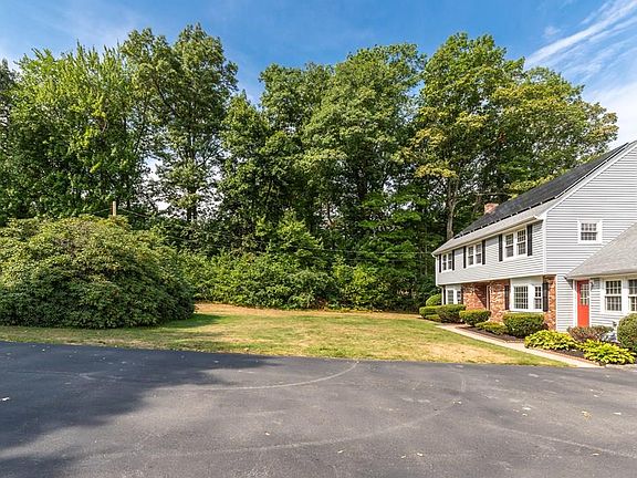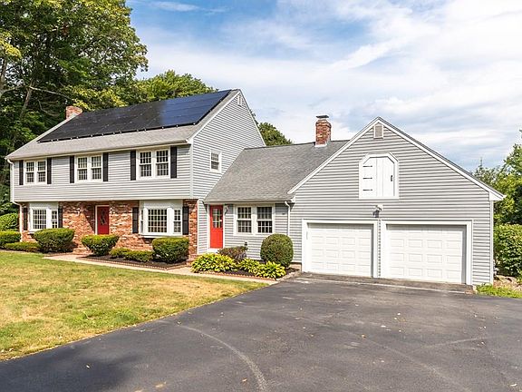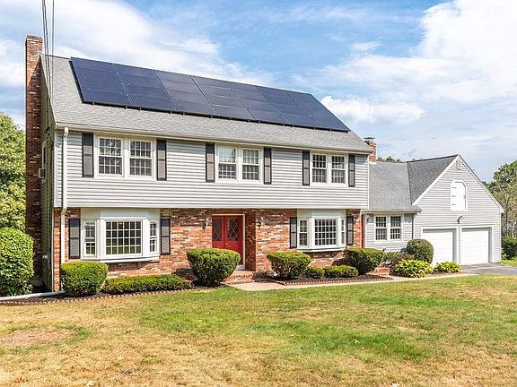 EXPANSIVE, CLASSIC Colonial set on acre+ picturesque lot in coveted area, with room for all to gather and enjoy! Double entry showcases a spectacular curved staircase and is flanked by enormous front to back living room with fireplace and bay window and gracious dining room with another bay window. Kitchen is nicely proportioned with plenty of counter space and room for lots of cabinetry and working island. Stunning family room with soaring, beamed cathedral ceilings features floor to ceiling grand fireplace with french doors accessing deck that runs entire back of the house, overlooking cleared, recreational backyard, complete with regulation volleyball court. Upstairs is spacious master bedroom with large walk in closet and ensuite bath and three more well proportioned, large bedrooms. Updated baths and new boiler. Solar panels are owned, transfer with home ~ low electric bills and significant rebates. . . . .This well loved home is ready for new owners to make it their own!