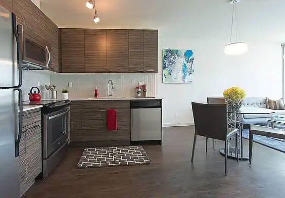 Quartz countertopsStainless steel appliancesFull size stainless fridgeSpacious balconyRooftop community garden