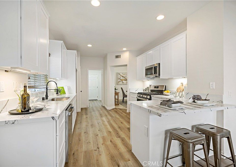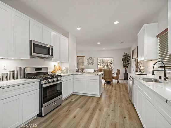 Situated on one of the largest lots in the quiet community of Belmont Seville in West Hemet, this newly re-imagined 4 bed (+ office / 5th bed) 3 bath home boasts low taxes, a low HOA & is truly move in ready. As you enter through the front door, a plethora of upgrades await including: new two tone paint colors, tall baseboard, tile flooring, luxury vinyl plank flooring, upgraded fixtures and much more. The oversized separate Living Room features lots of natural light, while the equally large dining room is ready for your Holiday gatherings. The gourmet kitchen boasts brand new white shaker cabinetry, striking quartz countertops, stainless steel appliances & a peninsula with barstool seating overlooking the breakfast nook. The cozy separate family room is yet another spot for game or movie nights. Rounding out our downstairs tour is a full sized laundry room leading to the garage, a large office / optional 5th bedroom & a downstairs powder room bath. Upstairs starts off with a large loft to go along with 3 secondary bedrooms, all of which share a newly renovated bathroom complete w/ a dual vanity offering stone countertops, designer mirrors & bold black plumbing & lighting fixtures. The oversized primary suite boasts an en suite spa like bath, complete with upgraded LVP flooring, a custom dual vanity w/ stone countertops & new fixtures, separate tub & walk in shower PLUS a large walk in closet. Last but certainly not least is the large private fully hardscaped backyard, complete w/ a wrap around patio w/ drainage, a raised planter bed & equally large side yards. A lot of bang for your buck here, and best of all its in West Hemet, a stones throw from Winchester, Menifee & the rest of the Inland Empire. Dual A/C & Heat (newer GIANT condensers), qualifies for VA financing and WILL NOT LAST!