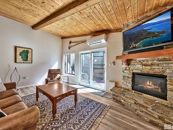 Stylishly refashioned throughout, this Lake Village townhome blends the comfort of rugged charm with a touch of modern flare. Enhanced by vaulted ceilings, lined in knotty cedar & warmed by a ledgestone gas fireplace, the great room flows seamlessly through to a lux kitchen, gilded in hickory cabinetry, slab granite and stainless appliances. Large redwood decks provide bookends to the main floor that includes a small office and ½ bath., The middle-level features a spacious entry/mud area, laundry and both bedrooms, including the primary suite with lavishly updated bath. Mini splits are found throughout and combine with forced-air to cover both A/C and heat for all seasons. A 2-car garage is found on the ground floor, along with spacious, lockable storage and mechanical area. This prime lakeside locale is a stone’s throw from premier east shore beaches, Stateline gaming and Heavenly ski resort. The HOA includes a clubhouse with billiards, a large outdoor pool & hot tubs, along with numerous tennis courts and kid’s playground.
