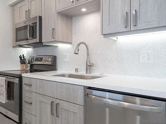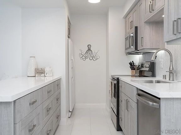 Come to our beach retreat and enjoy the sights and sounds of the Pacific Ocean at the highly desirable Coronado Shores. THis one bedroom, one bath unit is light and bright with a balcony overlooking the ocean. The living room offers muted greys, sand and whites much like driftwood. Get comfortable on the luxurious couch while watching a large flat screen TV and listening to the crashing waves. White tile floors in the living areas and comfy carpet in the primary bedroom which has a king bed and chaise lounge for reading and relaxing. Updated kitchen with quartz countertops and washed grey oak cabinets.