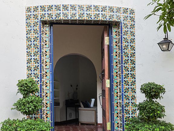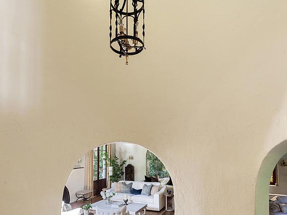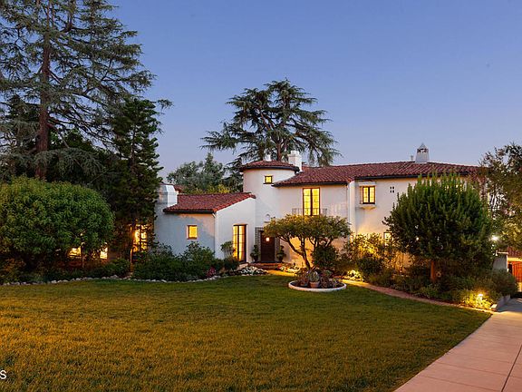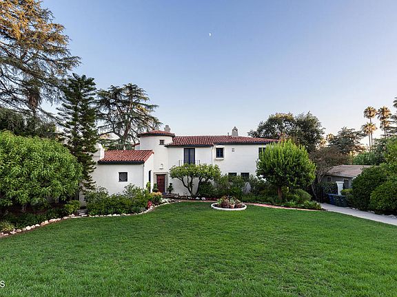This lovingly updated classic 1929 Mediterranean Spanish style home, located near the Altadena Town and Country Club, offers 5 bedrooms, 4.5 baths and 4,910 SF of elegant living space on a 19,350 SF lot. Enter through a stunning rotunda foyer with classic hexagon tile flooring. Above, you will see a charming wrought-iron interior Juliette balcony. The spacious step-down formal living room exudes architectural beauty, featuring a high stenciled beamed ceiling, great natural light, beautiful hardwood floors, a fireplace, and original wall sconces, curtain rods and a stained glass window. These first impressions set the tone for the amazing detail throughout. French doors in the family room open onto a covered balcony patio and the dining room has an arched entry and an arched window both providing wide valley vistas. The home has a charming library with a fireplace. The updated kitchen is a chef's dream, complete with a large center island, top of-the-line cabinetry, hard wood floors, and built-in high-end appliances. The adjacent breakfast room overlooks the rear yard through the bay window and is bathed in warm morning light. Down a hallway off of the kitchen is an en-suite bedroom with a built-in desk, currently used as an office. The staircase leading upstairs is adorned with colorful original Spanish tile on the risers. The upper level also enjoys great natural light, hard wood floors, and original wall sconces throughout. The large en-suite primary boasts a balcony off of French doors with a spectacular city view. Two additional bedrooms on this level share a large full bath with a tub and separate shower. The lower level centers around a second family room with French doors that open onto the rear yard. It is designed for entertainment. With a wet-bar and refrigerator, a large television, built-in cabinets, fireplace, and bookshelves for game storage, it is the perfect place to watch the game. Also on the lower level is a 5th bedroom and an updated 3/4 bath, an oversized laundry room with brand new washer and dryer and beautiful built-in cabinets. The grounds are lovely, with many mature trees, including a large avocado and a Meyer lemon, privacy hedges, and a raised vegetable garden. A long, gated concrete driveway leads to a 570 SF, 3-car garage with a workshop. Next to the garage is a fenced yard for dogs. There is a spacious grassy area and a large lit sport-court offering many options for outdoor activities and recreation, including pickleball!