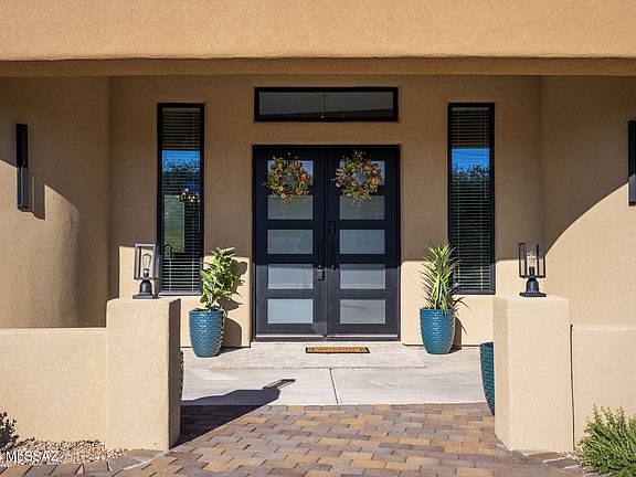 Discover modern Southwestern living at its finest in this truly one of a kind home that is nestled in a private cul-de-sac with panoramic views of the majestic Tumacacori Mountains. From sunrise to sunset, you'll enjoy unmatched desert beauty from your expansive wrap around covered patio complete with direct access from the primary suite. A grand paver driveway leads to the extended three-car garage, offering generous storage and a striking first impression. Inside, the spacious great room welcomes you with high ceilings, a cozy fireplace, and large windows that fill the home with natural light. The gourmet kitchen is an entertainer's dream, featuring dual islands, a prep sink, granite countertops, soft-close cabinetry, gold finishes, and top-of-the-line KitchenAid appliances including a wine fridge and dishwasher. A walk-in pantry provides ample space for organization and convenience. Retreat to the private primary suite, highlighted by elegant pendant lighting, a luxurious soaking tub, an oversized double shower, dual vanities, and a spacious walk-in closet with washer and dryer hookups. Each additional bedroom offers its own custom walk-in shower and closet, with one suite providing access to the back patio. The laundry room is fully equipped with custom cabinetry, a sink, and distinctive granite countertops, while the powder room showcases a unique curved wall and high-gloss cabinetry, a true design statement. Located just minutes from I-19, local conveniences, and the Tubac Golf Resort, this stunning residence offers a perfect blend of privacy, style, and modern comfort all surrounded by the tranquil beauty of Rio Rico's natural landscape.