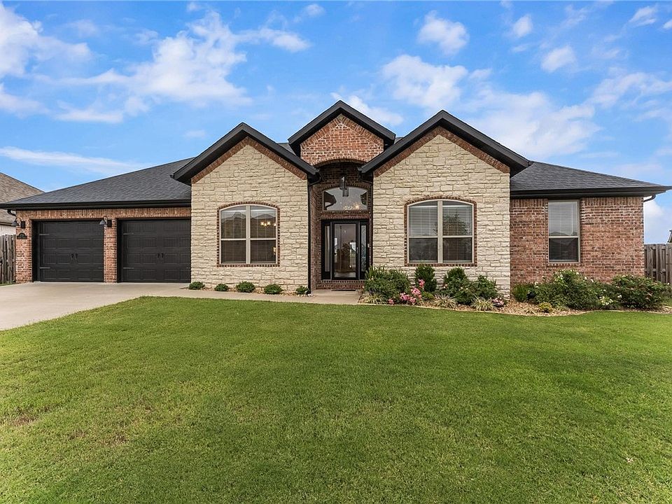 Welcome to 1770 Sunrise Cirlce. . . a meticulously cared for brick & stone 4-bed, 2-bath, split floor plan home located on a large level lot in a quiet subdivision. Walking distance to Centerton Gamble Elementary & 1 mile to Bentonville West High School. The kitchen features granite counter tops, stainless steel appliances, tons of cabinets and an eat-in kitchen space overlooking the backyard. Living space is open to the kitchen and flows perfectly for everyday living or entertaining with direct access to the patio. Dining room is located at the front of the house with flexibility to be used as an office or a family room. Ceramic wood-appearance tile floors flow throughout the main living space with carpet in the bedrooms. Primary suite includes a beautiful, over-sized tiled shower, walk-in closet and dual vanity. The level backyard features a covered patio, gas fireplace, wood privacy fence & plenty of space to customize as you wish. Convenient access to both Bentonville & Bella Vista with just 4 miles to I-49.