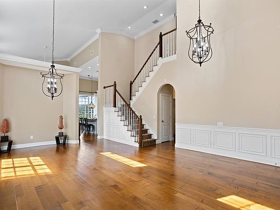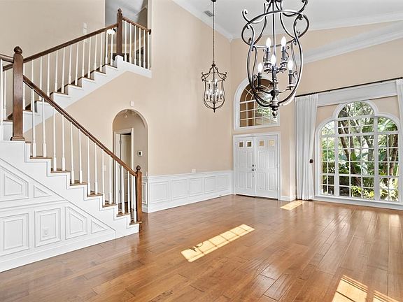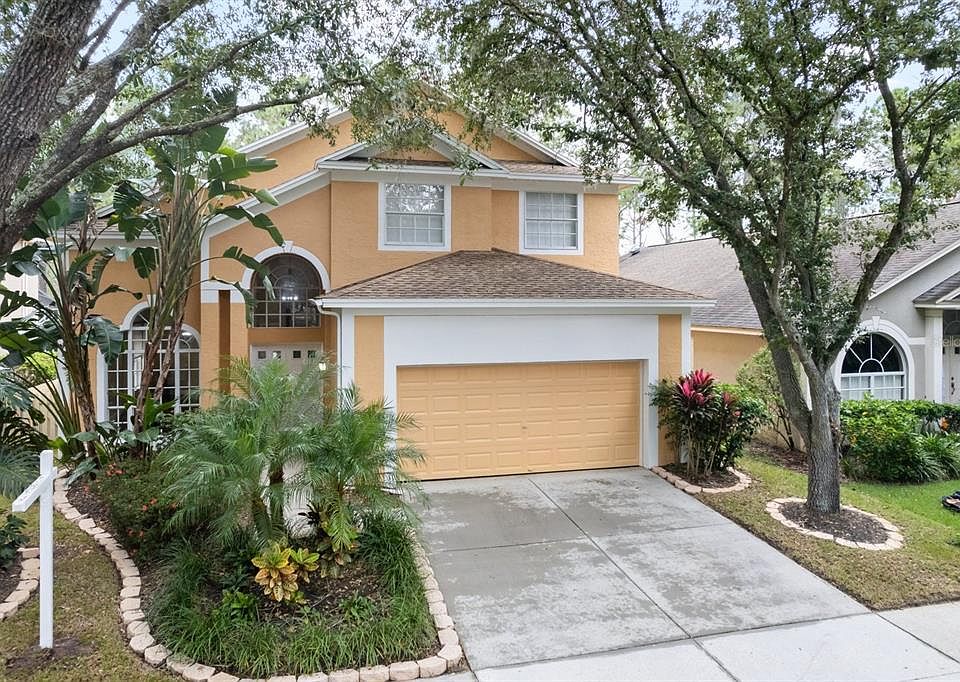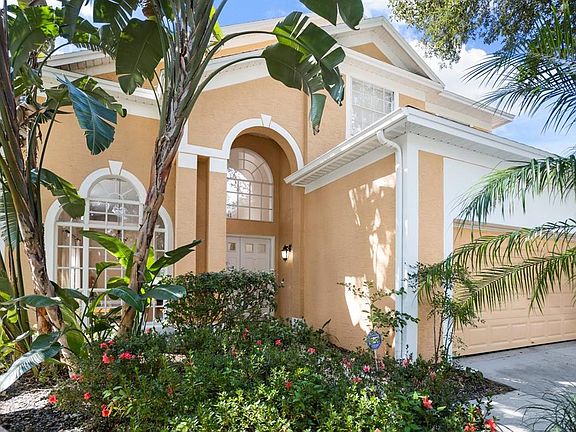 A rare find! Tastefully renovated with high-end details and situated on a stunning home site with peaceful conservation and pond views in the premier upscale community of Hunter's Green. The double door entry warmly welcomes you into a thoughtfully designed open floor plan with many transom windows casting natural sunlight throughout. Rich maple wide plank wood flooring, crown molding, architectural details, custom draperies/window treatments, updated lighting and vaulted ceilings that create a feeling of spaciousness. An elegant wood burning fireplace adorns the family room along with double doors leading to the screened lanai and fenced backyard. The kitchen is a chef's dream with exotic granite counters and backsplash, Wolf gas range, GE Monogram appliances and breakfast counter. The master bedroom suite is conveniently located on the first floor and includes spa-inspired bathroom with travertine marble flooring, granite counters, garden tub and separate shower. Upstairs are 3 bedrooms with a beautifully updated bathroom. The 2 car garage has ductless a/c ($5500). As part of this extensive renovation, the electrical panel was updated ($8500); flooring throughout ($23,000); updated a/c system ($25,000); closet organizers ($3200); crown molding ($5700); bathrooms ($52,000). The community has 24-hour manned gates and amenities include parks, playgrounds, basketball courts, lighted tennis / pickleball courts, volleyball, baseball fields, off-leash dog park, designated biking lanes, jogging trail with a 15-station exercise circuit, picnic areas and elementary school within. Hunter's Green Country Club membership is optional and offers the ultimate private club experience including access to the 18-hole Tom Fazio designed golf course, world class tennis courts, fitness center, resort-style pool and elegant dining facilities. Next door is the 17,000 acre Flatwoods Preserve. New Tampa has ample nearby shopping, dining, USF, easy access to I-75 and multiple hospitals.