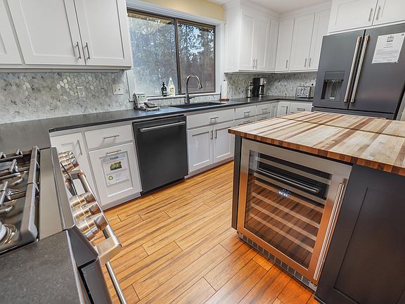 Welcome to 7 Rogue - Where Relaxation Meets Adventure! Beautifully remodeled Sunriver retreat tucked on a quiet loop just steps from the Deschutes River & trail system. Open great room with new bamboo flooring, custom wrought-iron railings, and an Ochoco Stone-wrapped wood-burning fireplace. The NEW gourmet kitchen showcases Café matte-black stainless appliances, custom cabinetry & pantry, butcher-block island, wine cooler, tiled backsplash & granite counters. Three bedrooms, 2.5 baths + garage game room (shuffleboard, darts, bikes). Rare private backyard with hot tub under the pines - a true Sunriver find! New roof (2023), dual water heaters, central A/C, Smart TVs in every room, 8 SHARC passes & keyless entry. Successful STR ($51K gross in 2024, $60k gross annualized for 2025). All furnishings negotiable and may convey on a separate bill of sale for a fully turnkey experience. Minutes to Cardinal Landing Bridge, Fort Rock Park & The Village. Listing agent related to seller.