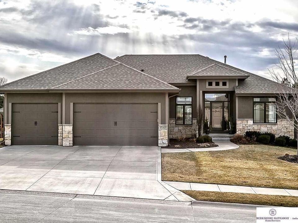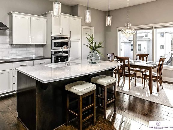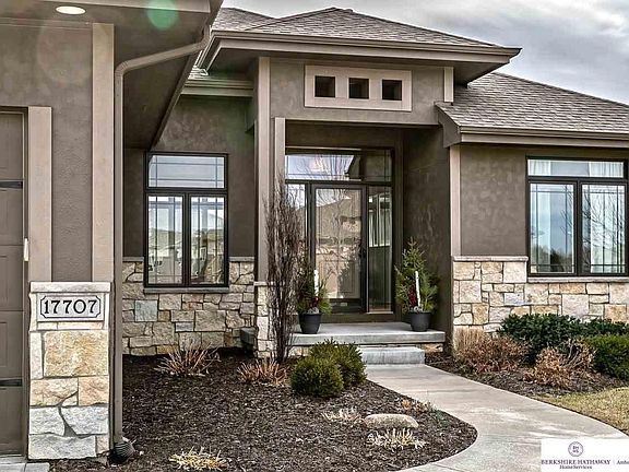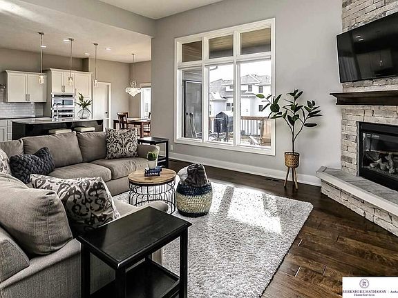 This fantastic ranch is full of upgrades and move in ready! Natural light greets you from the moment you step inside. All wood floor through the main family room and kitchen with white cabinets, upgraded stone fireplace, extra tall ceilings and sophisticated details. Walk in hidden pantry! 3 bedrooms on the main level with the master suite including walk in shower and the master closet connects to the laundry room for the ultimate convenience. Drop zone and locker system off the garage. The finished lower level is an entertainers dream with amazing wet bar, island and huge media space including surround sound In addition, a second rec space perfect for gym equipment, pool table or kid zone. 4th bedroom and bathroom as well. Backyard is fully fenced with covered deck and lower level walkout patio. Walk to school, parks and walking trails! Quickly hop on Dodge Street! Amazing and active HOA makes this neighborhood special.