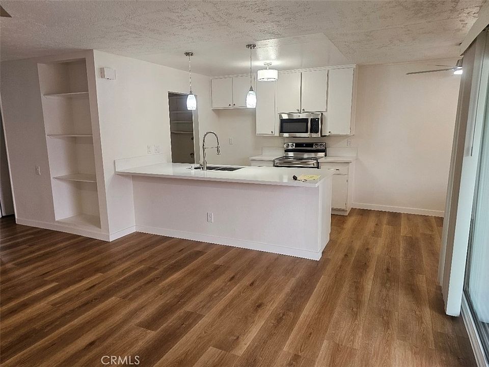 Completely remodeled! This is your chance to rent a beautifully remodeled top end unit! No one is above or below you. Brand new mini split air conditioning, With a unit in the living room and each bedroom. The kitchen is beautiful with a huge quartz counter. Great for food prep or use for meals. New appliances, and washer dryer hook ups. All the floors are brand new, with vinyl throughout most of the home, and carpet in the bedrooms. 4 new ceiling fans. One in the living room, one in the dining area, and one in each bedroom. New paint throughout. Completely remodeled bathroom. A new vinyl sliding door that leads to a patio overlooking the pool. This unit also has a 1-car garage PLUS 1 assigned parking space for added convenience. The association pool and spa are just steps away. This unit is move-in ready. Close to freeways, shopping and entertainment. This is a must see!