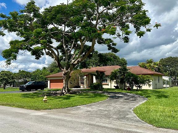 Beautiful home offers 4 bedrooms with custom walk-in closets, 2 bathrooms, 2-car garage, & generator hook up. Volume ceilings & Bahamas shutters adorn the living area. The beautiful screened-in pool remodeled in 2024, new salt system and new Jacuzzi and patio are perfect for entertaining. The brand new kitchen features granite counters, wood cabinets new high end stainless steel appliances including wine cooler. The expansive backyard has mature trees including mango, sugar apple, guava, carambola, Barbados cherries, lychee, orange. There is plenty of space on either side to park an RV or boat(s). The shed has power for convenience & accordion shutters are installed throughout. Nestled in a beautiful neighborhood with no HOA, this home is ready for its next family! Seller Motivated!