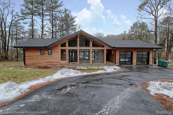 This stunning open concept home was built in 2022 with reclaimed wood from trees on the property. The spacious living room floors are Elm and Cherry with views of nature through the wall of windows overlooking the property. The high ceilings are White Pine. Wood fireplace. The sleek Italian kitchen has Scavolini cabinets, Bertazzoni appliances, Hinkley lighting, marble counters and island. It is a custom home built by local architect Jim Korf with 3 bedrooms, dining room, 2.1 baths. Primary bedroom has luxurious bath, 2 walk in closets and laundry room. An impressive staircase takes you to the lower walk out fully finished basement. There are 2 outside areas totaling 1200 sq ft, one covered the other open. 2 car garage. New gutter guards. PRICE BELOW ZILLOW ESTIMATE