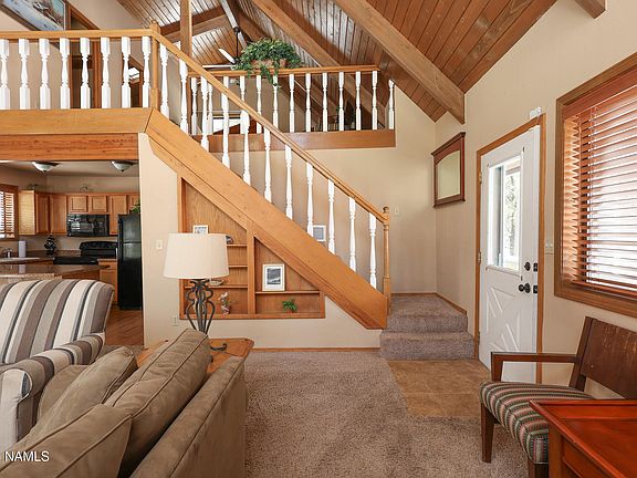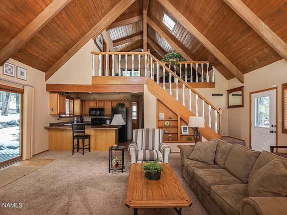 Highly Desirable Mountain Chalet on a well-treed cul-de-sac lot with wrap-around decks. Soaring T&G wood ceilings and a bank of windows that look out to blue skies and mature Ponderosa trees. A river rock fireplace with a wood insert to keep warm on those cool mountain nights. The kitchen boasts tons of natural wood cabinets for plenty of storage. The primary bedroom has a full bath and a large walk-in closet. Large ATV shed on the property for all your toys. This cabin comes furnished and ready for you to get out of the heat.