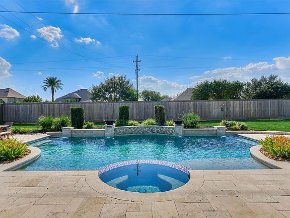 Highly desirable one-story Trendmaker home in Lakes of Fairhaven. From the moment you arrive, the curb appeal exudes luxury w a stucco + stone elevation, brand new roof, wrought iron gate & fire-lit lanterns welcoming you into a private courtyard. Through the glass-leaded front door, the foyer opens to a formal dining room on one side and a hallway leading to two spacious secondary bedrooms with a shared Jack-and-Jill bath on the other. A large study offers versatility, while the expansive kitchen with granite counters overlooks the family and breakfast rooms, all framed by views of the backyard retreat. The outdoor oasis features a sparkling pool, lush landscaping, and no back neighbors. The primary suite offers a spa-like bath with dual sinks, jetted tub, and oversized shower. A spacious game room provides entertainment, while an additional secondary bedroom with an en-suite bath is privately situated. Added features include a 3-car garage, generator, and no MUD taxes.
