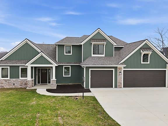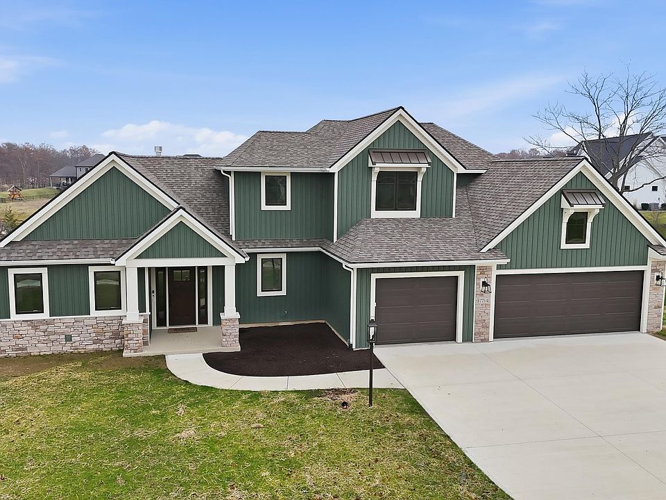 New Construction by Bob Buescher Homes | Estimated Completion: October 31, 2025. Welcome to this stunning new home located in the highly sought-after Tullymore Run community near Leo, Indiana. With 4 bedrooms, 2.5 bathrooms, and 2,689 square feet of beautifully designed living space, this residence is nestled on a picturesque water lot, seamlessly blending luxury, comfort, and tranquility. Upon entering through the foyer, you are greeted by an expansive great room featuring an 11’8” ceiling adorned with rich wood-stained beams and large picture windows that flood the space with natural light. A striking gas fireplace adds warmth and charm, creating the perfect atmosphere for cozy evenings or entertaining guests. The great room flows effortlessly into the open-concept designer kitchen, which boasts hickory cabinets, quartz countertops, a spacious island, and a walk-in pantry with a 42” cabinet—ideal for a coffee bar or additional storage. Adjacent to the dining area, a versatile flex room is perfect for use as a sunroom, den, or home office. The main level also features a thoughtfully designed primary suite, complete with a spa-like en-suite bathroom that includes a custom tiled, zero-entry walk-in shower, dual quartz vanities, a linen cabinet, and an oversized walk-in closet. The conveniently located laundry room is just steps from the primary suite, adding to the home's ease of living. Upstairs, a spacious bonus room awaits, serving as an ideal family lounge, media room, or play area. Three generously sized bedrooms and a full bathroom with a double vanity complete the upper level. Step outside to a beautifully covered rear porch, where tranquil water views provide the perfect setting for outdoor relaxation. Additional highlights of this exceptional home include luxury vinyl plank flooring throughout the main living areas, plush carpeting in the bedrooms and bonus spaces, and an attached 3-car garage with ample space for vehicles, storage, or a workshop. This residence showcases quality craftsmanship, modern design, and everyday comfort—all within one of Northeast Indiana’s premier neighborhoods. Don’t miss your opportunity to make it yours!