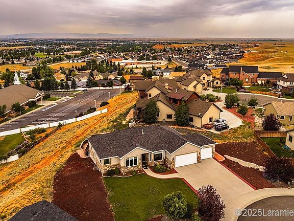 Luxury Living at Its Peak – A Once in a Lifetime home!! Welcome to one of Laramie’s most exceptional residences—an expertly crafted, over 4,000-square-foot luxury retreat nestled in the exclusive Laramie Ridge subdivision. This home is a rare combination of exquisite design, meticulous detail, and location perfection. Resting peacefully at the end of a quiet cul-de-sac, it offers breathtaking, unobstructed views of the Snowy Range Mountains and a sweeping view of Laramie below. From the moment you arrive, it’s clear this is not just another home—it’s a lifestyle. Built with enduring quality and timeless elegance, this residence blends form and function with a level of finish that stands among the best Laramie has to offer. Boasting over 4,000 square feet of living space, every inch of this home has been thoughtfully designed to provide a sense of comfort, sophistication, and connection to its natural surroundings. The main level features wide-plank wood flooring throughout, elevating the home's warmth and ambiance while maintaining durability and elegance. A gracious entry leads you into open, airy spaces designed to capture natural light and frame the stunning views that surround the property. The floor plan seamlessly integrates formal and informal living areas, offering flexibility for both daily living and large-scale entertaining. Whether you’re hosting holiday gatherings or enjoying a quiet evening by the fireplace, this home adapts to your lifestyle with ease. At the heart of this home is a high-end chef’s kitchen, complete with premium appliances, custom cabinetry, and gleaming granite countertops. The layout is both elegant and efficient, featuring a spacious center island with seating, a professional-grade gas range, and abundant storage. Whether you're preparing a gourmet meal for a crowd or a quiet breakfast with a mountain view, this kitchen is designed to inspire and perform. Custom lighting, soft-close cabinetry, and designer hardware speak to the quality of every decision made in this home’s construction. Anchoring the main living room is a beautifully crafted wood-burning fireplace, adding warmth, ambiance, and a focal point during Laramie’s crisp winters. Vaulted ceilings and large windows invite natural light into the space, enhancing the dramatic scenery just outside your door. Adjacent living areas offer comfort and flexibility—whether you prefer a formal dining space, a cozy library nook, or an inviting family room to gather around the fireplace. Each room flows effortlessly into the next, creating a cohesive and luxurious environment. The primary bedroom suite is a sanctuary of comfort and refinement with private access to the deck and additional unbeatable views! Downstairs you can find additional bedrooms, storage, living space, and walkout access to your private back yard and hot tub to take in those Laradise Nights!! All measurements are approximate, so please verify if material to purchase.