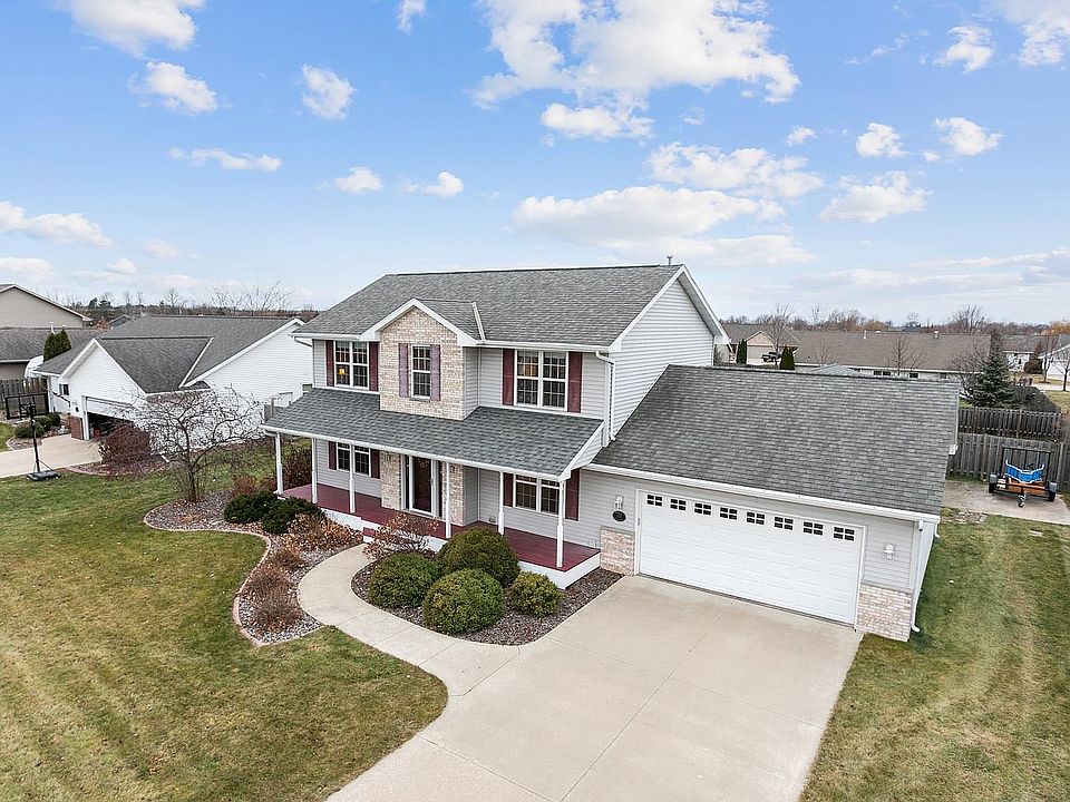 Move-in ready, Bellevue 2 story with inviting porch, large, fenced yard and second two stall finished garage/outdoor entertainment area. Features include: Foyer w/open staircase; LR with gas fireplace; Kit/Din with maple cabinetry, appliances and snack bar leading to patio and landscaped/fenced yard; MBR with two large walk-in closets; MBTH w/walk-in shower; BDs 2 & 3 with vaulted ceilings; 1st floor laundry; 1st floor Powder Rm; Finished LL FR, Rec Rm and Office area. This is a must see.