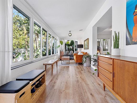 Step into this beautifully updated mid-century home where timeless charm meets modern sophistication.The residence has been reconfigured into a 3/3 featuring a spacious master wing. The kitchen is a culinary dream, boasting granite countertops, Italian porcelain floors, an oversized island, illuminated cabinetry, & high-end KitchenAid appliances—with a bar that makes entertaining effortless. Modern conveniences include a tankless water heater, impact windows & doors, & smart-home technology. A massive covered terrace, private courtyard, and a regulation-size badminton/volleyball court set the stage for alfresco enjoyment & fully irrigated yard with mature fruit trees creates a serene backdrop. Perfectly situated on a quiet street just two blocks from a vibrant mix of dining & entertainment