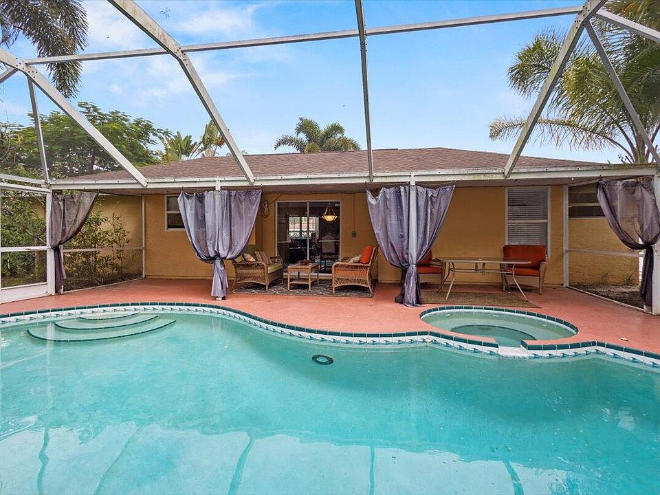 Back on the market--here's your chance to own this inviting 3BR, 2BA pool home on a spacious corner lot in Port St. Lucie. Relax in the screened pool with a brand new 2025 heater and pumps, unwind in the lanai, or entertain under the covered porch. Inside, engineered wood floors flow through the main living areas, leading to a bright kitchen with stainless appliances and granite countertops. The primary suite features a walk-in closet and tiled shower, while two additional bedrooms offer flexible use. The fenced yard provides privacy, mature fruit trees, and a utility shed for extra storage. No HOA. Across the street, Apache Park offers open green space, benches, and freshwater fishing for a peaceful Florida lifestyle.