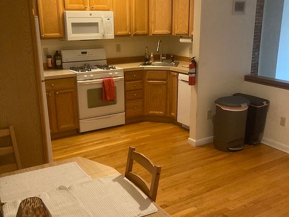 The eat in kitchen has lots of cabinet storage and contains a gas range, over-the-range microwave, dishwasher and refrigerator. The kitchen area can fit a large table and chairs.