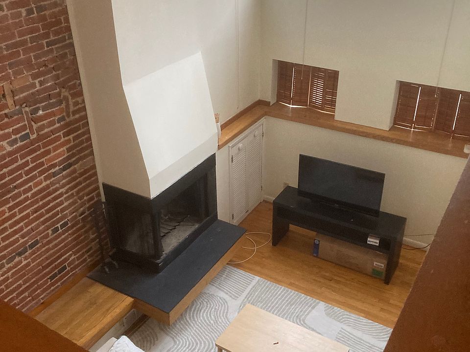 The apartment has hardwood floors throughout, high ceilings, large exposed brick walls, a fireplace and an outdoor deck.