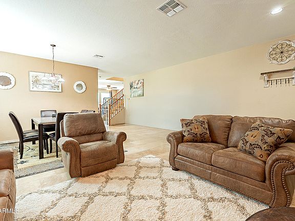 Beautifully updated 5 bed 3 bath home in the luxurious Bell Pointe neighborhood in Surprise! Offering modern upgrades & energy efficiency. This home features a newer roof (2021), exterior paint (2024), AC unit, Solar Edge solar (2021), & PVC irrigation system (2024). New tinted blue argon gas Energy Shield windows (2024). Real wood flooring in the living room & tile throughout the common areas. Newer kitchen appliances. The master bath boasts a jetted tub with heated/cooled jets, vibration, pressure control & a rain head custom tiled shower. The guest bath offers dual sinks. Additional updates include a water softener (2021), new fans (2024), new backyard sliding glass door (2024) & new pool pump (2024). Close to top schools, Loop 303, dining & Surprise Rec Campus. Move-in ready!