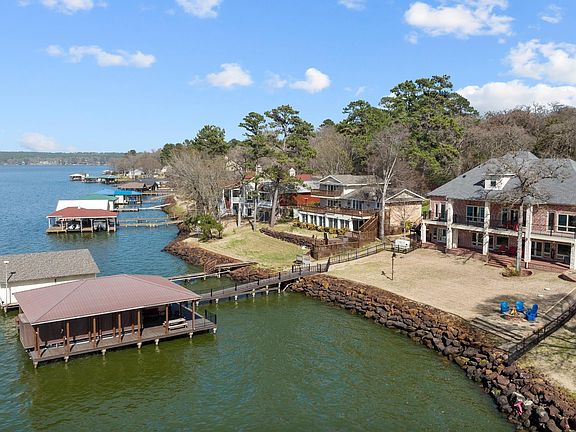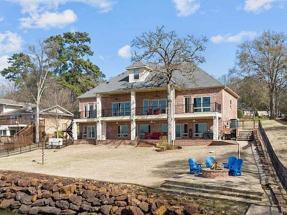 Sellers are moving & found home so READY TO SELL this exceptional waterfront home with breathtaking open water views of Lake Palestine! With approx. 6850 sq.ft., this 5 bedroom, 5 bath home has wide crown molding, 9-12' ceilings, solid oak & tile floors on main & lower level, granite counters, & 3' doors on all bedrooms. Enter through double doors to the main level living & dining/kitchen area with access to the elevated porch spanning back of the home. A gas stone fireplace adds to the ambience, flanked by custom built-in cabinetry. Kitchen has large island with 2nd sink, stainless warming oven, convection oven, microwave/convection oven, ice machine, dishwasher, gas cooktop, and built-in refrigerator. The primary suite, located on main level, benefits from the incredible open water views and access to the 2nd level back porch, as does a separate guest bedroom. Double french doors lead into the private office, complete with plantation shutters. Remote blinds have been installed in many rooms, with windows spanning both the main level and lower level lakeside. Downstairs second kitchen has granite counters, electric cooktop, oven, d/w, ice machine, & microwave. Be sure to notice the light fixture and star in the floor of the new custom built bar on the lower level, that includes an ice machine and refrigerated drawers! A huge 3rd floor carpeted bonus/game room, utility rooms on both the main & lower level, generous storage, 3 Rinnai water heaters, 2-central vacs, & 4 HVAC units & so much more! All new Marvin doors and windows lakeside. New welded metal fence. New aerobic septic system. Whole house generator has been added! A detailed list of updates/upgrades can be found in Associated Documents. Beautifully landscaped yard, gas firepit, bug misting system on home and and large 2 stall boathouse that includes touchless boat cover, storage, seating area & underwater lights. Just minutes from Tyler in Bullard school district!