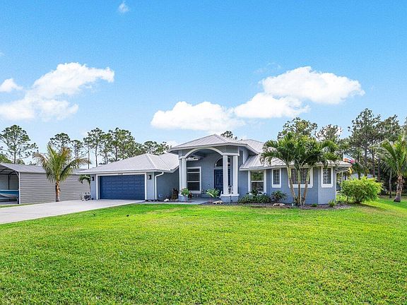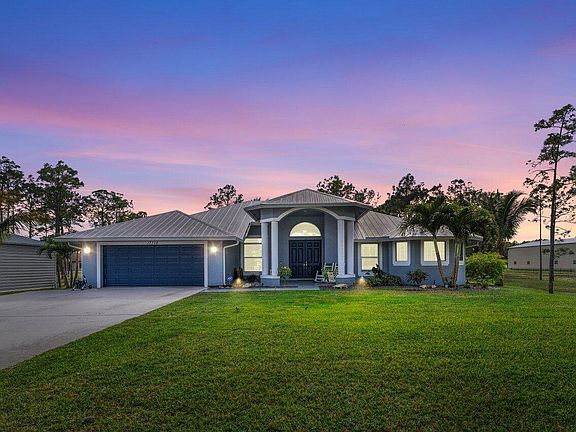 WELCOME HOME to serenity and (1.40) acres of country living! This stunning 2017 CBS built home features (3) bedrooms plus den, (2) full baths, (2) car garage, sparkling resort style salt water pool and patio area with waterfall tiki, CITY WATER, sought after paved road, metal roof, hurricane impact windows & doors, 25'x45' carport/shop featuring a concrete slab equipped with footers that can accommodate a guest house or CBS shop and is better than brand new! ENTERING this very well maintained property and sought after Pinewood 4 model you will discover that this gem is resting on a premium and fully fenced corner lot. The grand 20'x15'covered entry brings you into the 8' double front doors where you are greeted by a spacious foyer, soaring 12' ceiling, open living areas offering (CLICK) an abundance of natural light and a design that is exquisite! PASSING THROUGH you will find upgrades throughout, tray ceilings, expansive kitchen boasting a pool view, granite countertops, Whirlpool Gold stainless steel appliance package, walk-in pantry, 42" cabinets galore, (4-6) person bar and cozy breakfast nook that overlooks the pool. And hello spacious master suite featuring a tray ceiling, his and hers walk-in closets. The master bath boast beautiful white shiplap walls, his and her vanities, large walk-in sports shower with two rainfall shower heads, deluxe Jacuzzi tub, private water closet and granite countertops. You will also discover a dynamite split floor plan, beautiful color palette, tile and premium luxury vinyl flooring, high hat lighting, 9' x 6' under AC laundry room with Kenmore Elite extra large capacity washer and dryer, extra refrigerator and folding shelf. STEPPING OUTSIDE brings you into a private oasis... 31' x 9' lanai, expansive 65' x 30' patio boasting a 30' x 16' pebble tech pool with bar, tiki waterfall, 2 rotating multi color lights and bubbler, outdoor bar with a coral top, kegerator, plush fully fenced and sodded yard, professional landscape lighting, fire pit and countless mature trees such as; triple Christmas palms, coconut palms, pine trees, exotic frangipanis and more. Simply, a perfect space for relaxing, family gatherings, entertaining, outdoor fun and your very own Margaritaville! HELLO SAVINGS, PEACE OF MIND AND CONVENIENCE extra low homeowners insurance under $2,300.00 annually, fire hydrant within 50 feet, newer systems, in wall pest system, not located in a flood zone, newer systems, no pond, hardwired security system, full concrete driveway with extra parking and a convenient second driveway, the carport features a 14' ceiling, (2) 200 amp panels and multiple 220 and 110 outlets. Xfinity high-speed Internet, (6) Camera Arlo system, Ring doorbell, Hunter professional (11) zone irrigation with a new Goulds 1.5 HP pump that runs off of its own well, seamless gutter system, concrete septic tank, 50 amp garage outlet for generator hook up or welder, newer Porter Cable 155 PSI air compressor and garage utility sink. And the spectacular pool comes with Jandy equipment, a lifetime warranty pebble tech pool finish and was built by; Palm Pool & Spa which is the Palm Beach's most trusted family owned pool company and has been providing superior materials and craftsmanship since 2000. This beauty also comes with a transferable structure warranty until 2027 which covers all major structural items such as the foundation, roof, framing, load bearing walls, beams and top-of-the-line window tint by, Avery Dennison and the dual reflective film which provides: 99+% UV block to limit fading and sun damage, superior level of heat rejection to reduce energy costs, outstanding glare control for enhanced occupant comfort, preserved ambiance and views while maintaining daylight privacy and so much more! ABOUT THE BUILDER An award winning builder, RJM custom homes has developed a solid reputation for quality construction for two generations in South Florida. They are a premier South Florida home builder and build with energy efficient building techniques and have an A+ Better Business Bureau (BBB) rating. LOCATION LOCATION LOCATION This gem is tucked away in a superb Loxahatchee/Acreage location with Hamlin Park within walking distance/1.33 miles, shopping and dining just around the corner and nine quaint parks with countless year-round outdoor activities such as; free concerts at the community amphitheater, play grounds and picnic areas with grill pavilions, fishing, skate and equestrian parks, fitness and equestrian trails, football, baseball and soccer fields, tennis, basketball, volleyball and racquetball courts and is located just minutes to everything one could possibly desire; Florida's Turnpike, I-95, Palm Beach international Airport, arts, entertainment, world class equestrian shows and facilities, beaches, theater, golf, business and economic development, education, green living and conveniently located within minutes to everything your heart could possibly desire. COME AND SEE WHY The Acreage/Loxahatchee are so sought after and take in the fresh country air and peaceful sounds of nature. Build a chicken coop, bring your toys, pets or just about anything your heart desires... The possibilities are endless and there is no HOA! Come and enjoy your life away from the hustle and bustle and your evenings gazing at the stars. Be sure to check out the walk-through video link.