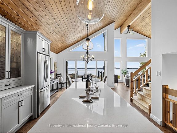 Natural shorelineSoaring cedar ceilingsEngineered hardwoodBespoke kitchenBeautifully finished bathroomsFarmhouse sinkPanoramic lake views