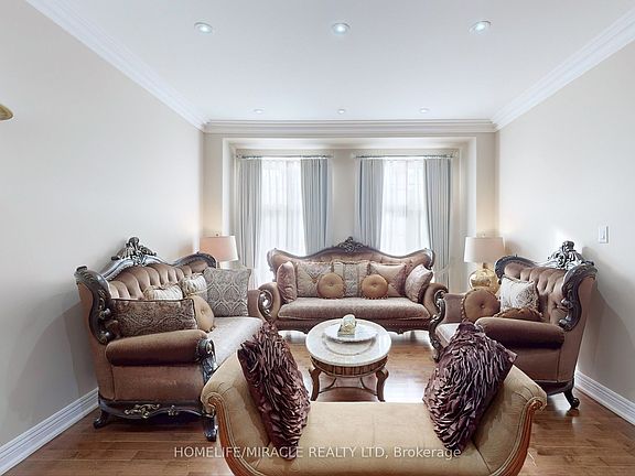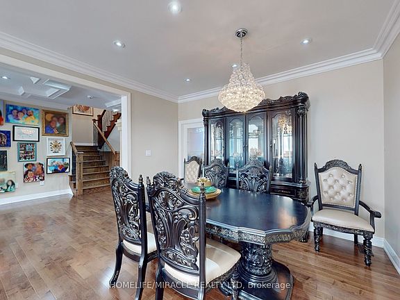 Welcome to this beautiful custom-built home located in Pickering. Standing on nearly 6,000sq.ft., including the walk-out basement, the home greets you with an impressive double door grand entry to a long, inviting hallway that flows smoothly into the generous family & formal dining rooms. The house features 9ft. ceilings, hardwood floors, crown moulding, pot lights, &oak stairs with wrought iron spindles. The iconic living, dining, & kitchen, is perfect for spending time with family or hosting friends. A dramatic, ~20ft long floor-to-ceiling glass wall floods the space with natural light all day long. The second-floor mezzanine over looking the living room, gives a loft-like feel that allows a connection between the two levels. The view from the second-floor, especially during winter evenings, feels like you're looking out from a hill-top chalet. The gourmet kitchen boasts a large center island, granite counters, custom cabinetry, & stainless-steel appliances. The 3-piece washroom on the main floor sits beside a generous room with closet; perfect for multi-generational living or benefits family members with mobility issues. The expansive second floor (~2,200 sq.ft.) offers 5 spacious bedrooms, 3 luxurious washrooms, and laundry room. The primary suite features His & Her walk-in closets & 5-piece washroom with dual vanity, soaker tub & large standing shower. A second primary bedroom with ensuite, two additional bedrooms with Jack & Jill washroom, & the 5thbedroom can be creatively used as an office, yoga/Pilates room, prayer room, playroom for the kids, or library; the options are endless. At ~1900 sq.ft., the bright walkout basement with pot lights, built-In-bar, 3-piece washroom & ample storage space is perfect for large gatherings. Conveniently located mins away from 401, Shopping Plazas, tons of restaurants, grocery stores, and top Durham schools this home blends architectural elegance with modern comfort. A rare executive offering-book your showing today.