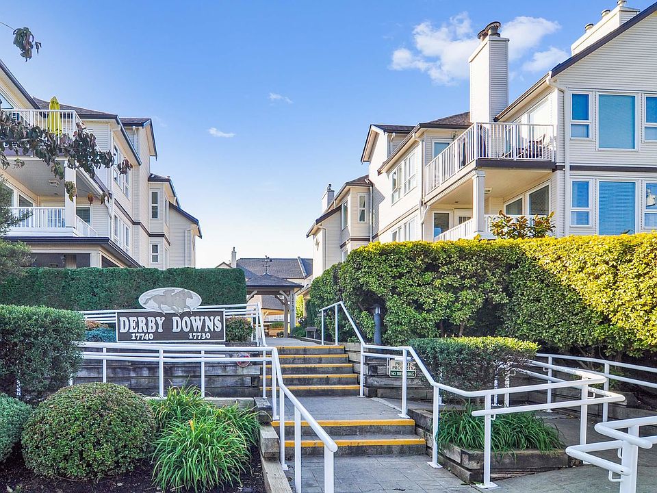 Derby Downs - CORNER,END,GROUND floor unit with access from patio. Privacy hedges, fenced yard and lots of outdoor space. This beautiful 2 bedroom, 2 bathroom open bright unit awaits. Kitchen has been remodeled, stainless steel appliances, white cabinets, counters/island & lighting. Dining room spacious and walk out to the open, fenced large patio with turf and fenced private yard/area great for the pets. Living room bright with cozy fireplace. Master is king size worthy, walk thru closet and 3 pc ensuite. 2nd Bdrm very large. In suite laundry fees pay radian heat,hot water and gas fireplace. Walking distance to all amenities.Very well run strata, proactive. 1 parking and locker included. Don't miss this end/ground/corner unit shows very well.