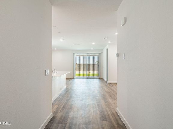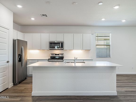 This NEW Construction home is almost ready for you and has 1,545 square feet, 3 bedrooms, 2 bathrooms, and 2 car garage! Our Quick move-in homes will include appliances and backyard landscape with turf. Est. to close in May. Our Hummingbird features an open concept with beautiful natural light, a modern neutral color palette, offering 36'' white shaker cabinetry, upgraded quartz counter tops, a large kitchen island, and 9' ceilings throughout. You'll love our smart home features, as well as dual pane low-E windows, Ceiling fan pre-wires, under cabinet lighting in the kitchen, and window coverings. The exterior features front yard desert landscaping, a covered patio and private backyard. Located off the 303, this community is near Costco, Safeway, and shopping. Photos are similar home onl