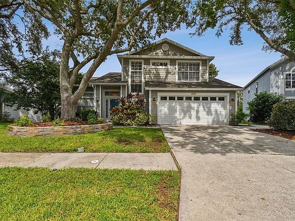 Welcome to this beautifully maintained 3-bedroom, 2.5-bath, 2-car garage home, perfectly situated on a prime lot in the highly sought-after guard-gated community of Hunter's Green. With tranquil lake views and a backdrop of the Flatwoods Preserve, this rental offers peace, privacy, and a rare connection to nature. Step inside to soaring ceilings, bamboo wood flooring, and fresh paint throughout the main living areas. The primary suite is located downstairs, featuring vaulted ceilings, a walk-in closet, and a beautifully updated en-suite bath with granite countertops, dual sinks, and plenty of storage. The kitchen is thoughtfully updated with granite countertops, LED lighting, modern appliances, and a deep sink combining style and functionality. Upstairs, you'll find two spacious bedrooms with plush carpeting, a full bath, and ample storage. Enjoy evenings on the screened patio while taking in serene lake and preserve views. As a resident of Hunter's Green, you'll have access to 24/7 security, miles of walking trails, tennis courts, parks, and playgrounds, with optional membership available for the Tom Fazio-designed golf course, fitness center, pool, and clubhouse.