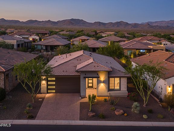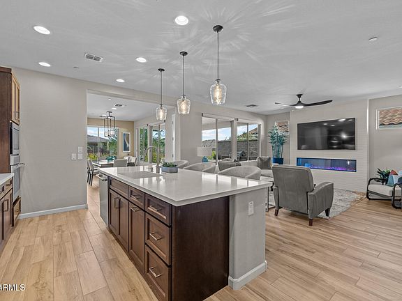 Featuring the popular Nice floorplan, this 2-bedroom, 2-bath home with office in the coveted Trilogy at Verde River community offers spectacular mountain views and refined upgrades throughout. Inside, the great room is highlighted by a striking fireplace wall with an electric fireplace, complemented by elegant window coverings, pendant lighting, and a sophisticated dining room fixture. Practical touches include a water softener, garage cabinets, and epoxy garage floors. Step outside to entertain in style with a built-in BBQ grill and privacy wall, perfect for savoring the breathtaking surroundings. Modern, comfortable, and move-in ready, this home blends luxury living with everyday functionality. The amenities at Verde River are World Class with Tom Lehman inspired eighteen-hole Golf course, tennis courts, pickleball courts, and bocce ball, heated lap pool and Resort style swimming pool, hot tub, Afterburn fitness center, Helen's demonstration Kitchen for cooking classes and a 7.5 acre dog park. The community center has casual poolside dining at Eddy's Diner and gourmet dining at award-winning Needle Rock Kitchen and Tap, Alvea Spa with full-service Salon and Spa amenities, Art Loft and events center. Trilogy at Verde River is adjacent to the Tonto National Forest and is situated in the middle of miles and miles of hiking and biking trails.