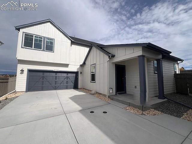 Ready now! Moonflower 2-story plan in The Foursquare Collection at Monument Junction. 3 bedroom, 2.5 bath, 2 car garage home. As you step through the front entry, you'll be greeted by a charming den and a conveniently located powder bath. The open floor plan seamlessly flows into a spacious great room, perfect for both relaxation and entertaining. Adjacent to the great room, you'll find a dining area that opens up to a covered patio, ideal for alfresco dining and outdoor enjoyment. The kitchen boasts Shaker style white cabinets, complemented by elegant Artisan Grey Quartz countertops in a leathered finish. A large island, capable of seating four, serves as a focal point for gatherings and casual meals. The kitchen also features a pantry and stainless steel appliances, including a gas range and refrigerator. Head upstairs to the primary suite, a serene haven located on one side of the upper level for maximum privacy. The primary bedroom includes a bathroom with a spacious shower, a vanity with dual sinks, and a generous walk-in closet. Separated from the primary suite the two additional bedrooms provide ample space and comfort. These bedrooms share a well-appointed secondary bath. Blinds are included in the upper level beds and baths. The upper level also includes a laundry room equipped with cabinets and countertop and washer and dryer adding convenience to your daily routine. The home comes equipped with air conditioning, smart home package, and active radon mitigation system. Full yard landscaping and a fence provide a beautifully manicured yard and privacy for your family. This home is nestled in a beautiful brand-new, covenant-protected community in Monument. Seller incentives are available.