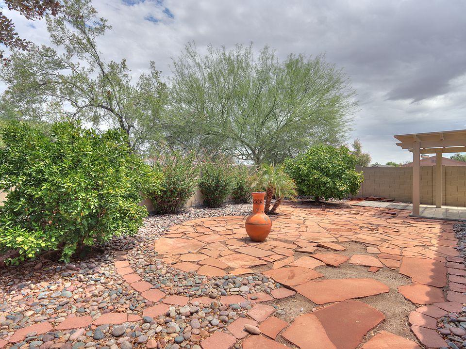 Pergola for shaded relaxationLush greenerySouthwest-style chimineaBreakfast barWalk-in closetFlagstone patioSpacious primary suite