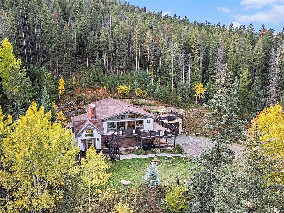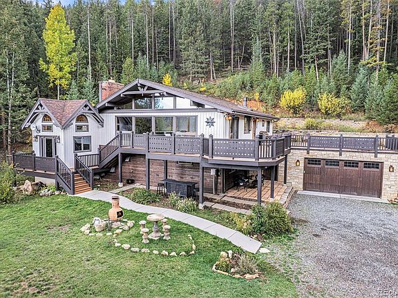 Step into storybook charm with this one-of-a-kind Bavarian-style chalet in beautiful Evergreen, Colorado. Perfectly positioned on a serene creek and surrounded by towering pines and Aspens, this 4-bedroom, 3-bathroom home offers a rare blend of European character and mountain tranquility. Inside, warm wood beams, custom detailing, and large windows bring the outdoors in, flooding the home with natural light and capturing picturesque views. Ideal for both full-time living or weekend escapes. Downstairs, a fully finished walk-out level includes a mother-in-law apartment—ideal for guests, rental income, or multigenerational living. Outside you will experience the soothing sounds of Upper Bear Creek. The fabulous deck lends itself to hosting unforgettable gatherings beneath the stars, or just commune with nature. Whether you're sipping coffee at sunrise or watching the snow fall in winter, this property is a true four-season sanctuary. Located just minutes from downtown Evergreen, with easy access to hiking, biking, and skiing, this chalet is a rare gem for anyone seeking rustic elegance and alpine lifestyle.