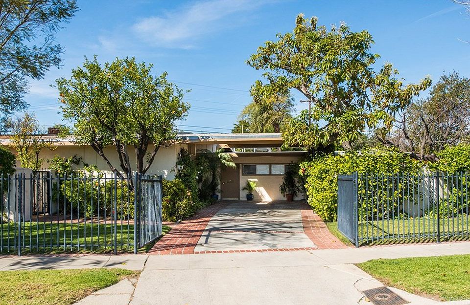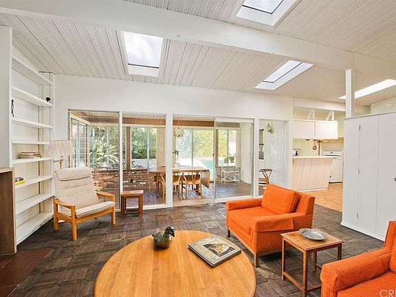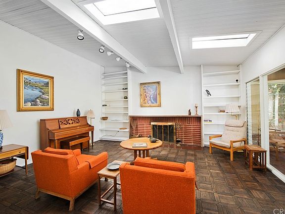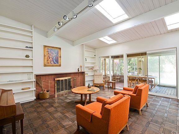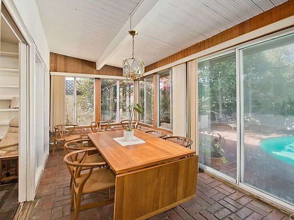 Charming Mid Century Modern Pool Home! Designed by noted architect Edward Fickett. Features include 3 spacious bedrooms, all with the vaulted, wood beamed ceilings that you would expect from the mid century design. All bedrooms with built in shelving & ceiling fans. The master suite features an en suite full bathroom. One of the secondary bedrooms features a slider that opens to it's own private patio. The living room features a soaring ceiling, skylights, cozy brick fireplace,lots of built in shelving, and opens to the enclosed patio and dining room. Newly refinished parquet wood floors in the dining room and kitchen. Spacious enclosed patio is currently set up for dining, but could be a great family room. The garage was converted to a rec room with lots of built in cabinets, desks, shelving, and a bench seat with storage underneath. This could also be a great office space, family, or hobby room. The back yard features a sparkling pool with brick hardscape, and raised planting beds with lots of mature fruit trees. The gated front yard features a spacious lawn area with more fruit trees, and a serene private patio with a raised planting bed. There is an attached workshop - radial arm saw included - and an attached garden shed. Gated car port in front. Recently painted. Very well maintained. Light and bright throughout. A true gem!