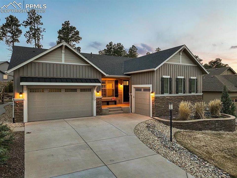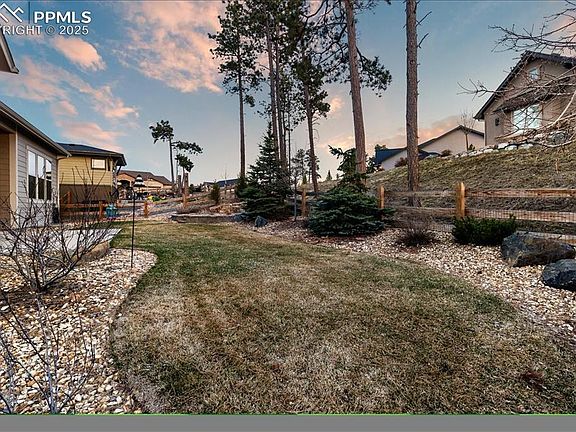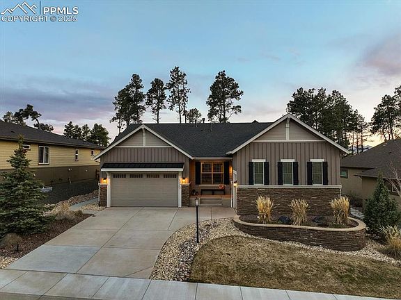 This incredible ranch plan in Sanctuary Pointe has traffic-stopping curb appeal and so many upgrades, we don't blame you if you lose track of them all. Easy care LVP floors with upgraded carpeting, built-ins throughout, two fireplaces, extended cabinetry, basement wet bar, beamed ceilings, formal office with French doors, luscious low-maintenance landscaping in the front and back of the 1/5-acre lot, and SO MUCH MORE. Inside you'll find a fully upgraded kitchen with double ovens and a gas cooktop plus a corner pantry and a beautiful curved island. The centerpiece of the living room is a stunning oversized picture window, an unusual premium upgrade that captures those gorgeous forest views. Also on the main floor is a spacious laundry room, a primary suite that has a spa-bath with a shower AND a soaking tub, with an adjacent, customized walk-in closet. This home is perched at the end of a quiet street, cul-de-sac adjacent for very little through traffic. Views of Pikes Peak and the Front Range are prominent through the oversized windows, most of which are finished with shutters and custom blinds and window treatments. The private, treed back yard backs to the distant edges of two front yards, for the ultimate in privacy, and features gorgeous landscaping including a bubbling rock feature. The covered back patio has plenty of room for grilling and guest seating, which you'll love as you enjoy your first summer in Sanctuary Pointe. The garage is insulated and finished, with epoxy flooring and an electric car charger. This home is also just steps away from the neighborhood trails that lead right into Fox Run Regional Park without having to cross Baptist - there's a secret tunnel in the forest beyond! This friendly neighborhood also has two parks, miles of forested natural trails, lots of community activities and friendly neighbors who enjoy healthy lifestyles! D-38 schools, close to major traffic corridors, schools, shopping, restaurants and more.