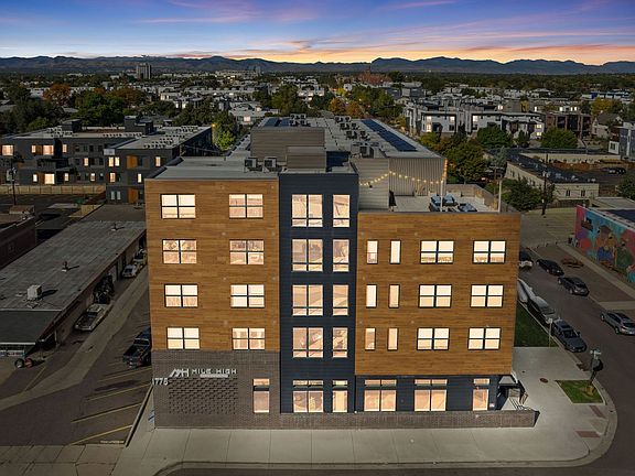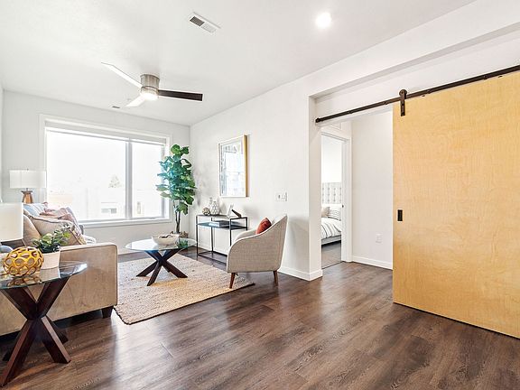 Average unit sizes exceed 940 square feet and unit interiors include quartz countertops and backsplashes, stainless steel appliances, barn doors, wood-style flooring, 9+ foot ceilings, built in custom storage, keypad entry, and built-in fiber optic service. Our B-1 floor-plan is a 2 bedroom unit with a flex office space, great for working from home. A rooftop deck offers 360-degree views of the Broncos Stadium at Mile High, downtown Denver, and the Rocky Mountains. Additional community amenities include a lobby with large windows, exposed concrete work, reclaimed wood, and a private package system area.