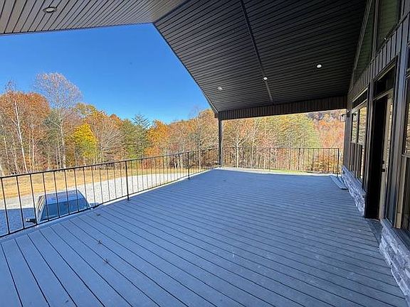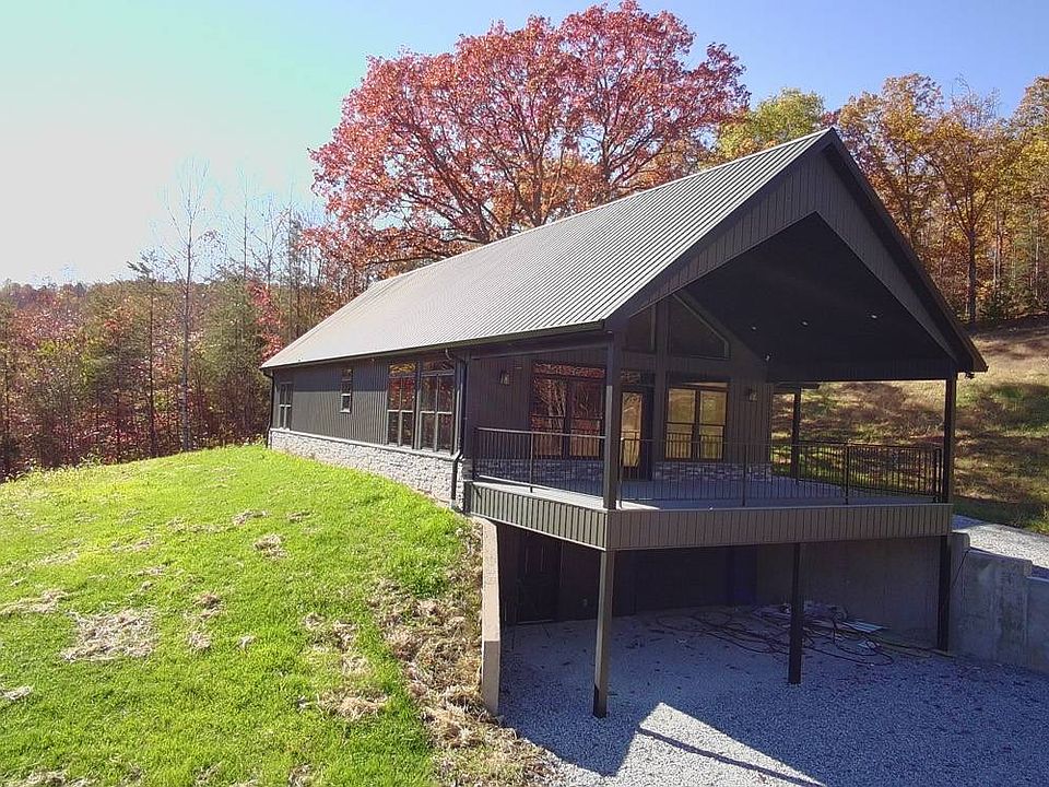 HOME - GET AWAY - LODGE all in one. Can be purchased as home & 7.72 acres m/l. (Tract #6). Brand New Home with all the extras including granite, wood floors, cathedral ceiling and high ceilings, a true custom build. Home has open living room - dining - kitchen with the large living room having a 20 ft. tall wood cathedral ceiling, opening up onto a 16 x 26 concrete elevated porch, modern kitchen with all stainless appliances and ding area. Primary suite with large bedroom - spacious tile bath with granite - walk in tile shower - walk in closet w/ utility area, 2 additional bedrooms with tile hall bath, plus 2 car carport. Home has a full basement with metal clad finished walls. Ideal get away, mostly woods with great hunting and trails. Located 1775 Fisher Creek Road.