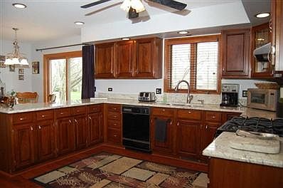 OPEN CONCEPT IN THIS BEAUTIFUL RANCH.GORGEOUS NEW CHERRY LAMINATE FLOORS. TWO SIDED FIREPLACE IN LR/FR. CHERRY CABINETS/GRANITE COUNTER IN FULLY APPLIANCED KITCHEN. FRENCH DOORS FROM LR/FR TO THE GREAT DECK WITH GAZEBO. LARGE ACRE PLUS LOT. NEWLY REPAVED CIRCLE DRIVE. DOUBLE TANK SEPTIC. TWO FURNACES AND AC'S THREE CAR GARAGE. MAIN FLOOR LAUNDRY, LARGE BASEMENT TOO!
