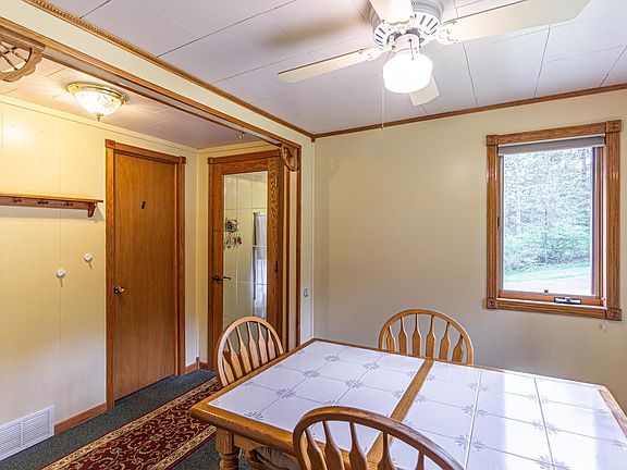Loved & meticulously maintained 3 Bedroom, 2 Bath home with a 2 stall detached garage, on a diversly wooded 1.76 acre lot. The main level features a combination kitchen & dining room, bedroom, full bath, living room with west facing bay window and sliding doors that lead to a 10 x 12 deck with awning. The other 2 bedrooms are located upstairs, a small office room and a half bath. The generous yard is full of green space with beautiful flowering trees and a combination of red & white pine, maple, and crab apple trees. The detached garage is very clean, insulated, and has a propane heat source and work bench. The convenient circle drive is paved with asphalt. This home is tucked in the woods, quiet and private; located on the edge of town. Well & Septic.