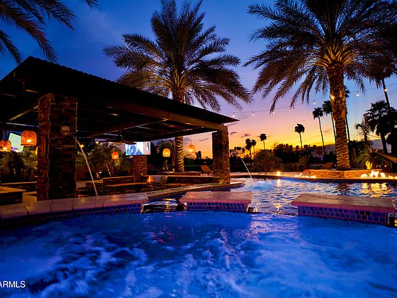 This tropical backyard oasis is a true showstopper! An oversized heated pool with a massive waterfall grotto, sun shelf, oversized spa, and swim-up bar under a sunken ramada make it feel like your own resort. Mature palms, lush backlit landscaping, stonework for days, a huge putting green with chipping area, turf horseshoe court, and multiple fire features complete the paradise on .62 acres. Sunsets over your private golf course lake? Unreal.