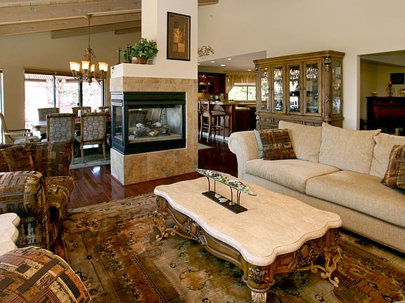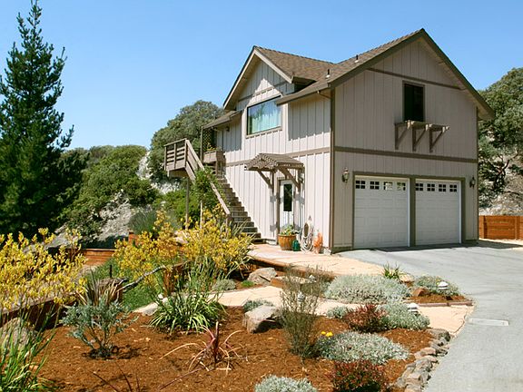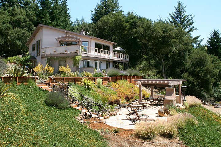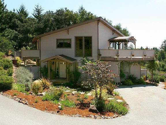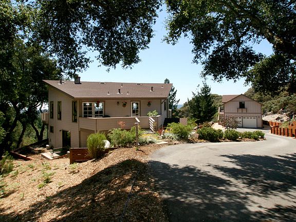 Panoramic ocean and valley views overlooking 9 serene acres. Beautifully remodeled 3000 square feet, 4 bedroom, 4 bathroom home with reverse floor plan—enhancing the incredible views from the main living areas. The home features spacious rooms with living room opening to dining area and kitchen, wood floors, gourmet kitchen with granite counters, gorgeous custom cabinetry, breakfast bar, separate island, gas range and huge walk in pantry. Separate family room with fireplace and adjoining bathroom could be 4th bedroom. Fireplaces in master suite and family room plus center fireplace divides living and dining rooms. There is also a 500 square feet guest suite with full bath and kitchenette above detached two car garage. Outdoor patio area with fireplace and kitchen, wonderful decks surrounding the home as well -providing amazing outdoor living retreats.