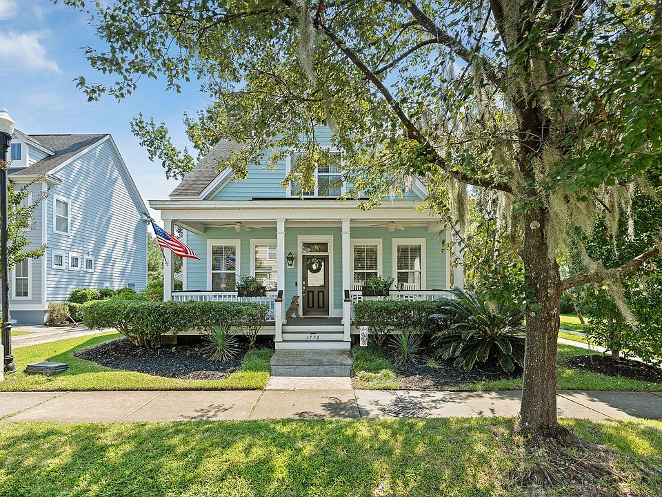 Located in the highly sought-after Carolina Bay Subdivision of Charleston, South Carolina, this 3-bedroom, 2.5-bathroom cottage style home offers a combination of modern updates and functional living spaces. The home features a first-floor primary bedroom with a large bathroom, dual vanity, renovated shower, garden tub, and a walk-in closet. The open first-floor layout includes 9-foot ceilings and wood floors throughout the main level, creating a spacious and cohesive flow.The kitchen has quartz countertops and stainless-steel appliances, including a new dishwasher installed in September 2025. Also on the first floor is an office with built-in shelving, and a half bathroom. Recent updates enhance both comfort and efficiency, including a new tankless hot water heater installed in 2024 and a Daikin 3.5-ton gas split system HVAC installed in April 2023. The interior and exterior have been repainted, and the half bath has been renovated. Gas lanterns adorn the spacious front porch. Upstairs, the loft/play area includes built-in shelving and two bedrooms connected by a Jack and Jill bathroom, which was recently updated with new tile and a new vanity, providing flexible spaces for family or guests. Outdoor living spaces include a large screened-in porch and a 12x30 deck overlooking a pond in the fenced backyard. A detached two-car garage sits back from the street, accessible via a long driveway that provides ample parking. The property is located near several points of interest and convenient city access. Downtown Charleston is approximately 15 minutes away, Mount Pleasant is about 10 miles, and Summerville is roughly 20 miles, offering easy commutes and access to shopping, dining, and recreational amenities. This Lowcountry home blends functional design, recent upgrades, and outdoor living opportunities in a subdivision known for its community setting and convenient location. The fenced backyard with pond views and deck, coupled with a detached garage and ample driveway space, provides practical options for everyday living.