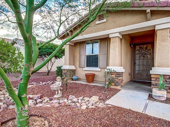 Bona-Fide Best Buy! Coming Home is Nicer at this Price! 3 BR's + Den, Office, or Playroom! Wood floors thru-out, except BR's, Baths, Den. Secluded Master separated from others. Home backs to an out lot for added privacy. Community pool, splash pad, parks, and school nearby. All appliances are included. Granite counters in Kitchen + stainless appliances. Gas range. Tankless hot water heater means you'll never run out of hot water. Back yard offers elevated planter boxes for growing vegetables, herbs and flowers. Husband's generator in back yard included ''as is'', wife never used it. APS Solar Rental Program provides $30 monthly credit on your electric bill with maintenance and servicing by APS.