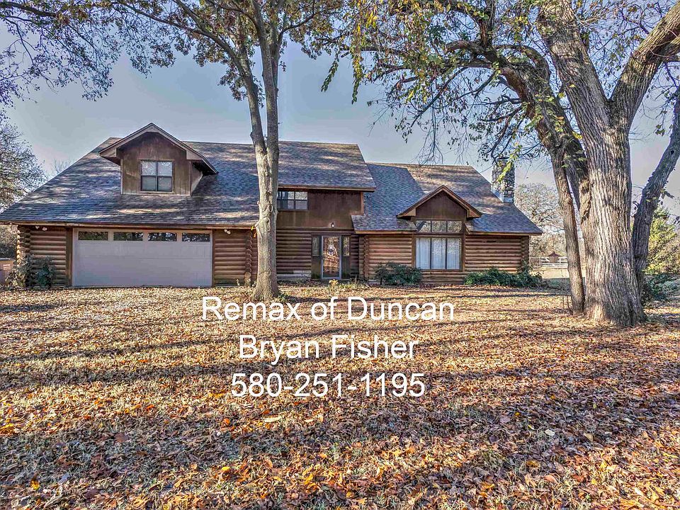 One-of-a-Kind True Log Home on 5 Treed Acres — 177611 N 2800 Rd, Duncan, OK 73533! Discover the warmth, charm, and endless potential of this one-owner true log home, perfectly placed on 5 beautiful, heavily treed acres in a peaceful, park-like setting. This rare property offers room to breathe, space to grow, and a lifestyle that feels like country living just minutes from town. Featuring 4 spacious bedrooms (all located upstairs) and 2.5 baths, this home offers exceptional space for comfortable living. The large master suite steals the show with abundant storage and oversized closets—truly a retreat of its own. Downstairs, you’ll find two inviting living areas, each highlighted by gorgeous wood-burning fireplaces that were just professionally cleaned. With two dining areas, there’s plenty of room for hosting family gatherings and entertaining guests. A convenient half bath is located on the main level. Outdoors, the opportunities are endless. Enjoy mature pecan trees, a water well, storage shed, dog pen, and plenty of areas to add a shop, additional sheds, or even keep some livestock. The property provides privacy, shade, and stunning natural beauty all around. While the home needs a bit of TLC, it boasts tons of potential and is priced to sell—a fantastic opportunity for someone ready to update and make it their own. All of this in a fantastic location, just down the road from a nice convenience store and a short drive into town. Selling "as is condition." Listed with Bryan Fisher, RE/MAX of Duncan Call Bryan at 580-251-1195